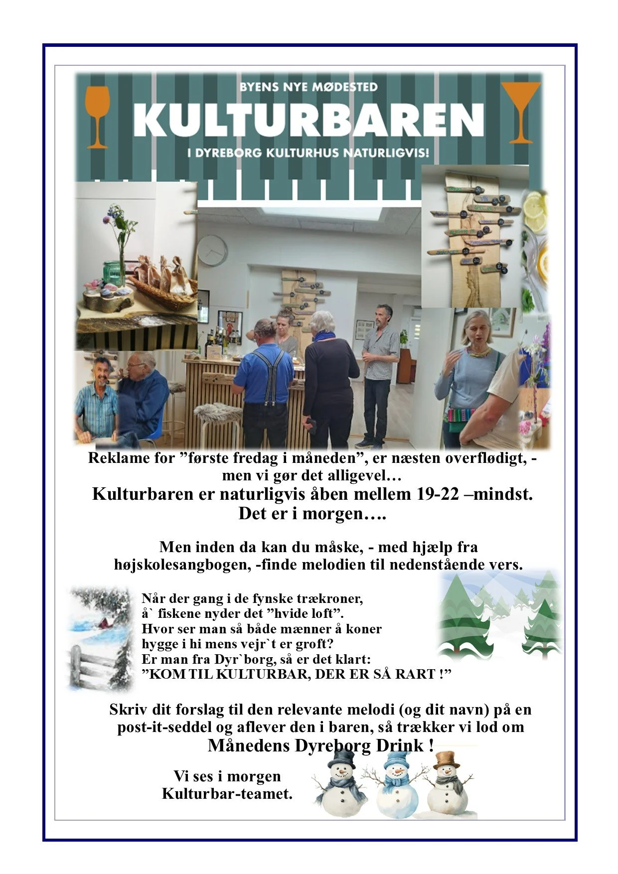 Jeg er ved at færdiggøre et oplæg, hvor vi kan udvide sortiment af lege, og placeringer i Dyreborg, og håber I har lyst til at drøfte dette, og brainstorme løs søndag d. 1. februar i Kulturhusets lille sal kl. 14.00